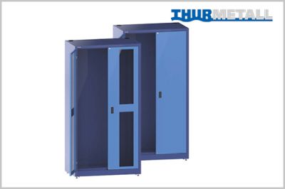Der Thur Metall E-Flügeltürschrank ist geeignet für größere Gegenstände wie Geräte oder Kanister. Die Türen sind wahlweise aus Vollblech oder mit Sichtfenster lieferbar, um einen noch schnelleren Überblick zu ermöglichen. Der Schrank bietet zahlreiche