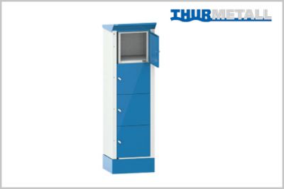 Die E-Bike-Ladestation ist der Thur Metall Fächerschrank für den Außenbereich, serienmäßig mit vier Fächern ausgestattet und in