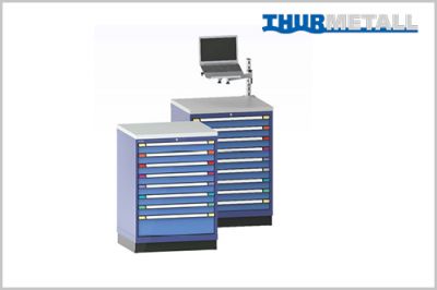 E-Schubladenschränke von Thur Metall gibt es in zwei gängigen Abmessungen. Sie lassen sich flexibel mit Schubladen in allen verfügbaren Höhen befüllen und eignen sich für unterschiedlichstes Lagergut von hochwertigen Werkzeugen bis zu Medikamenten. Dazu können sie mit verschiedenen Energiemodulen und Thur Metall Einteilungsmaterial optimal an die eingelagerten Gegenstände angepasst werden.